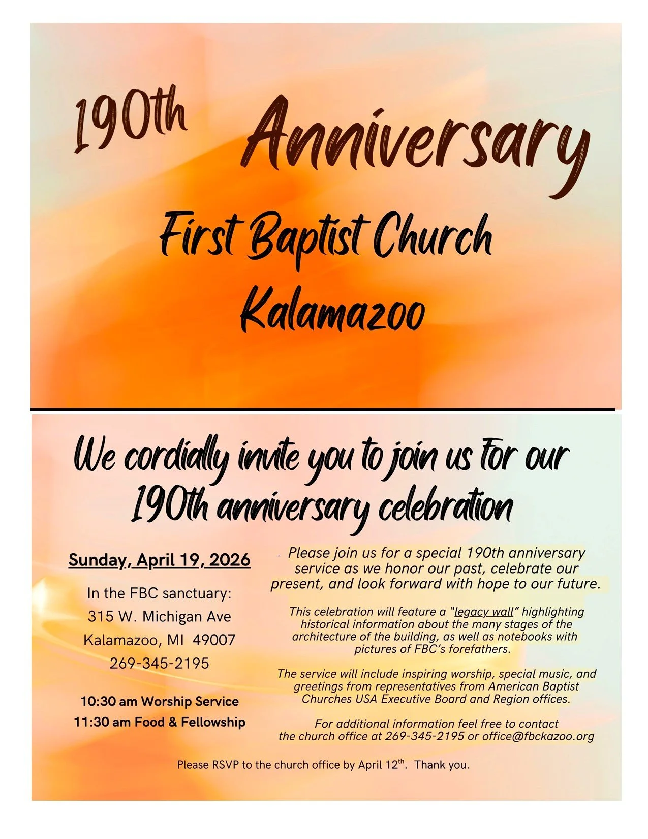 Join us to Celebrate 190the Anniversary of First Baptist Church of Kalamazoo